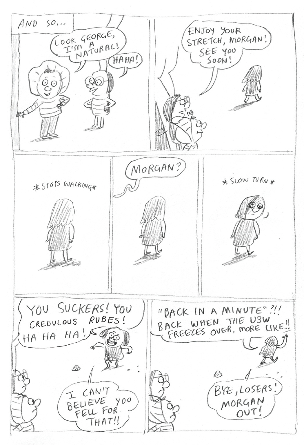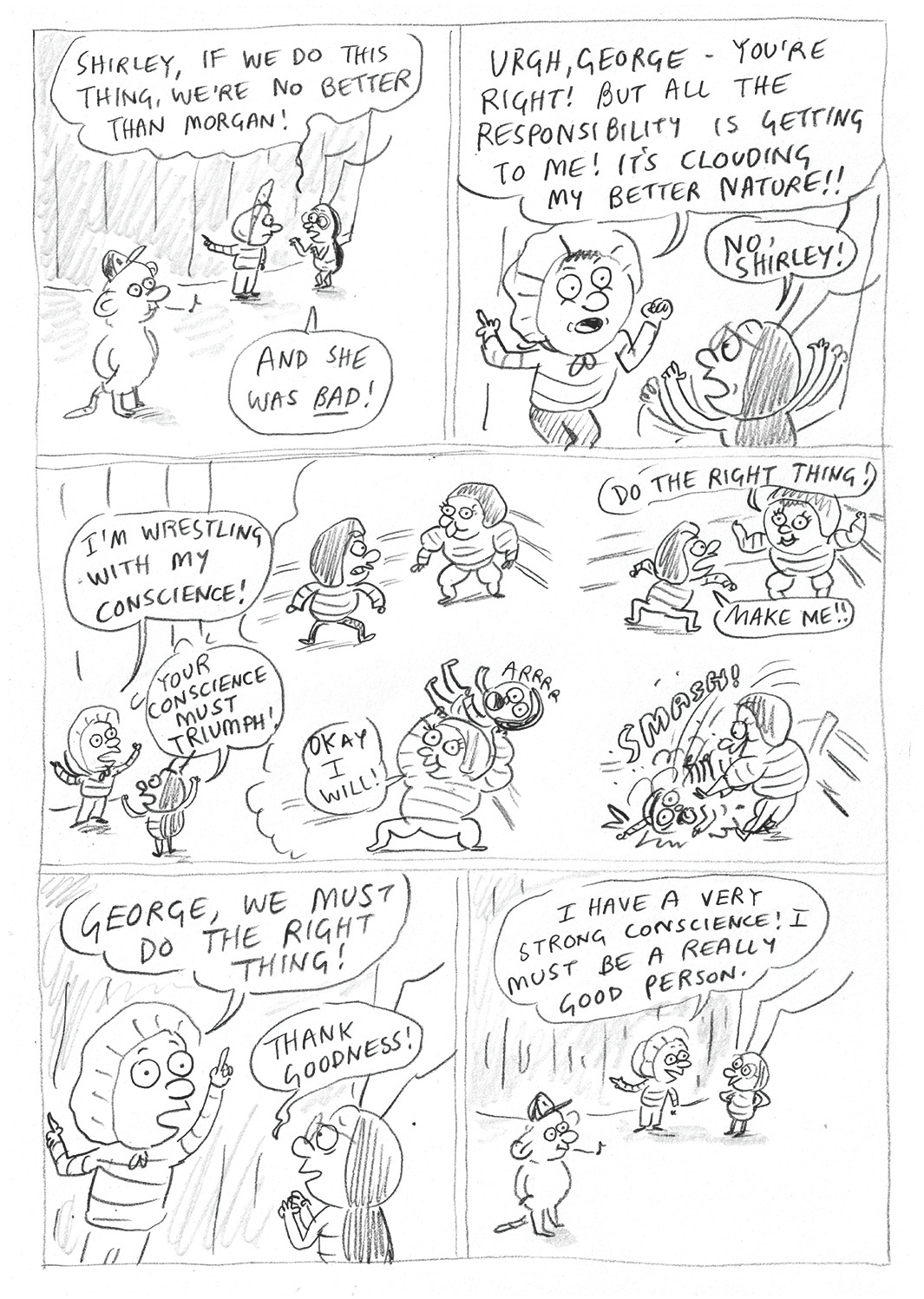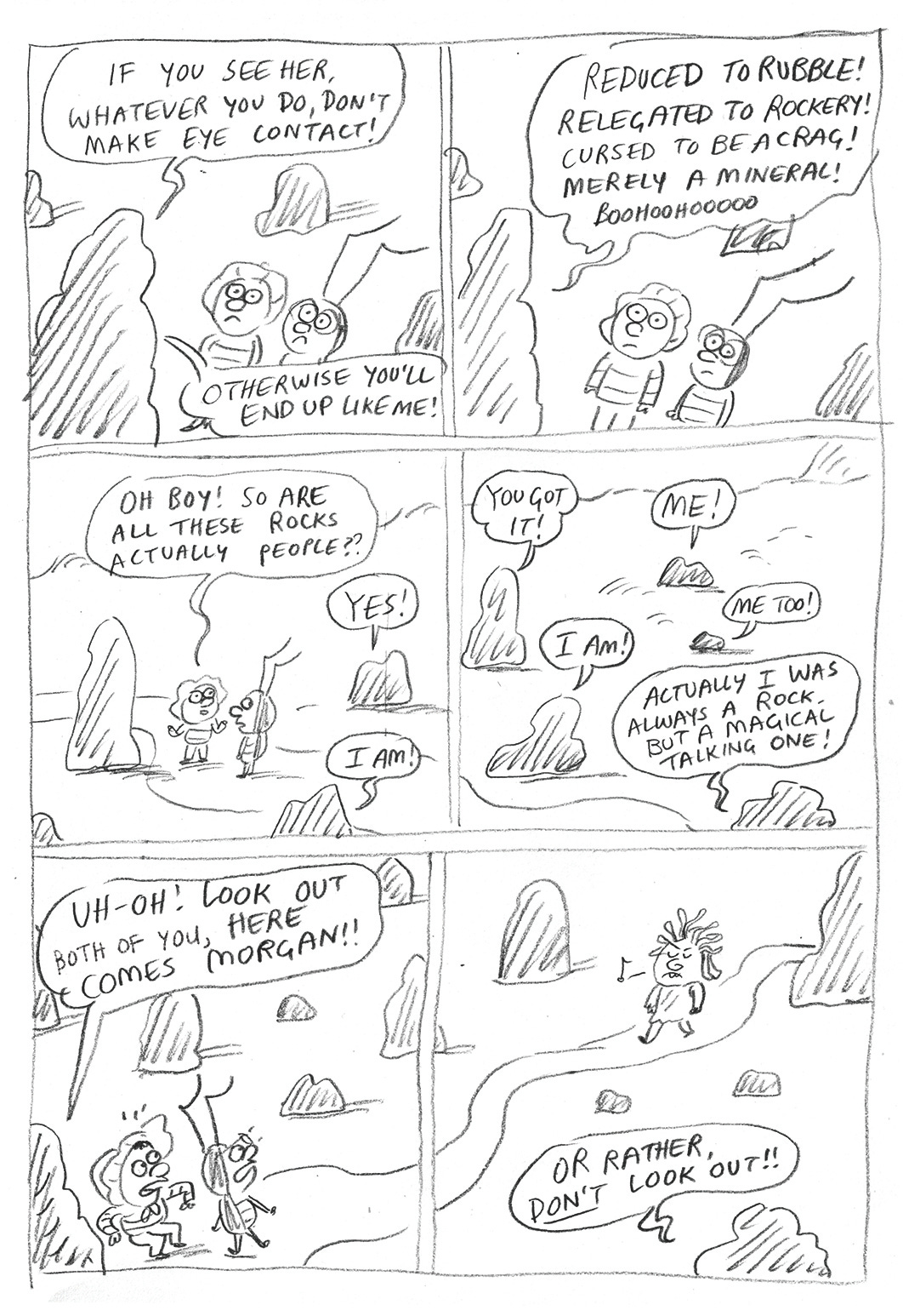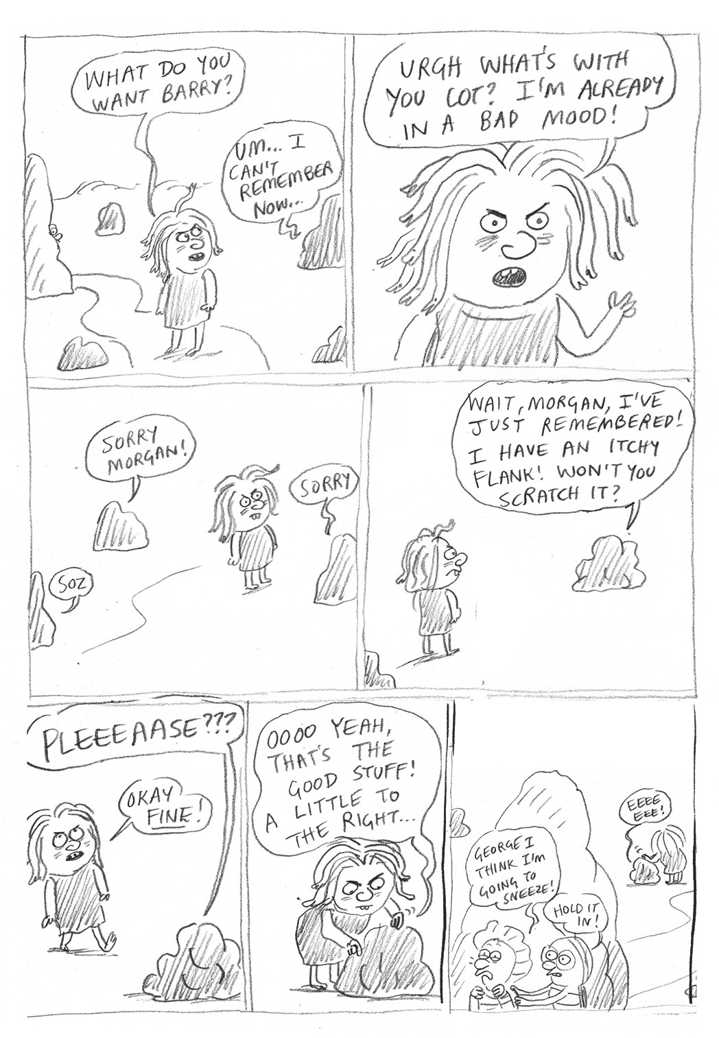 I couldn’t give this whole bit an arc to make it work, so then Morgan lost her gorgon status and was became a general untrustworthy baddie. In this bit, Shirley and George have just encountered Morgan with her finger in a hole…