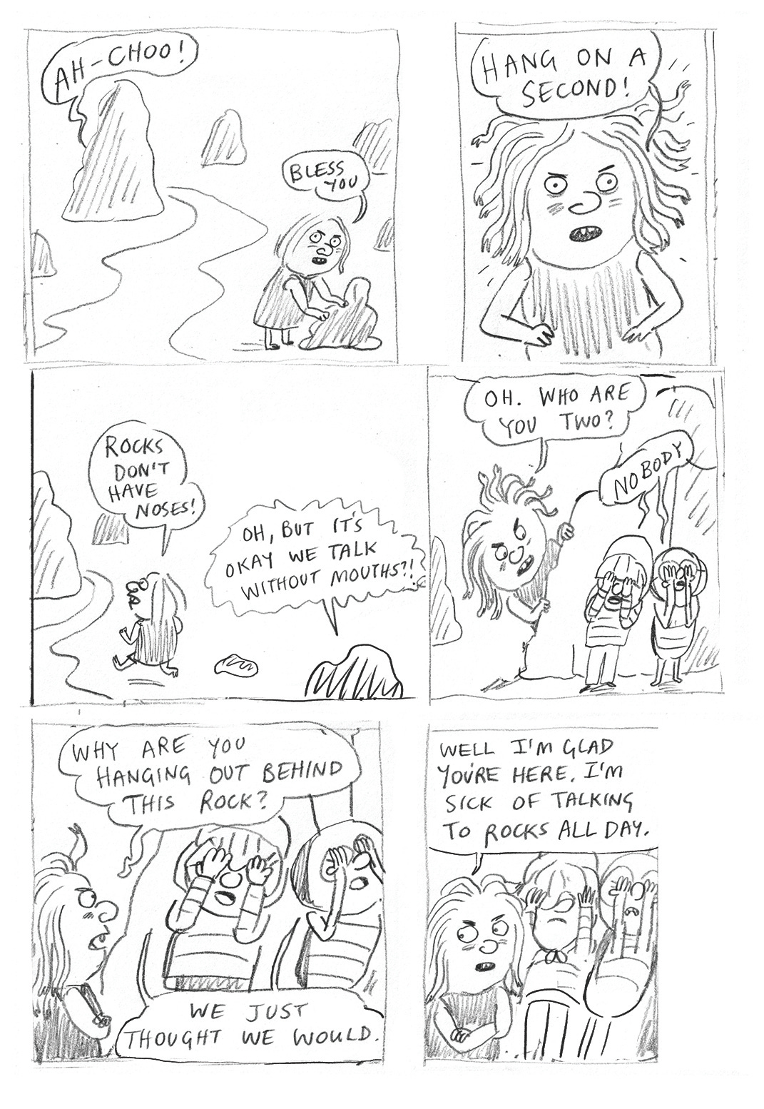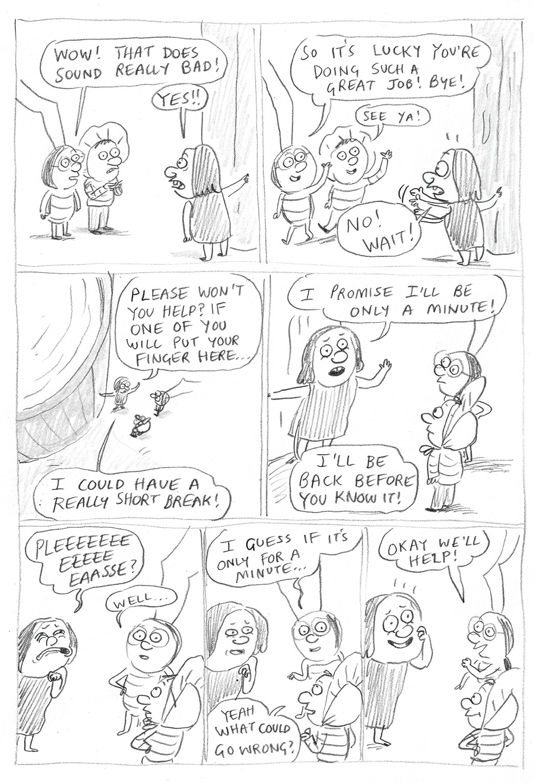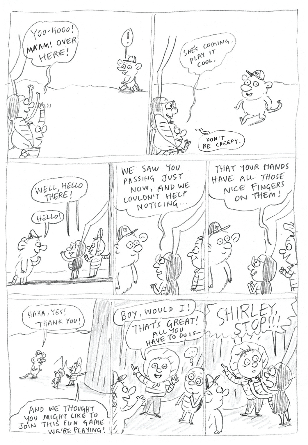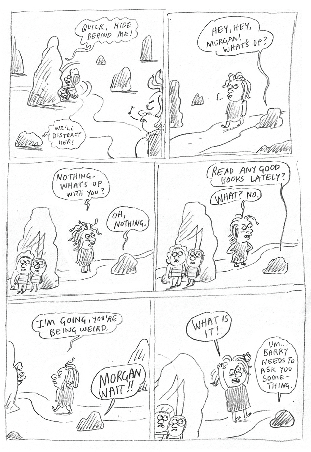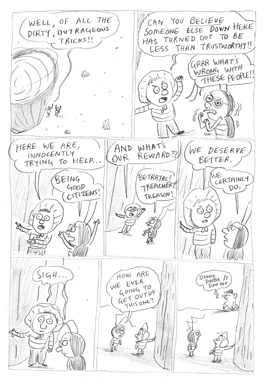 I couldn’t give this whole bit an arc to make it work, so then Morgan lost her gorgon status and was became a general untrustworthy baddie. In this bit, Shirley and George have just encountered Morgan with her finger in a hole…