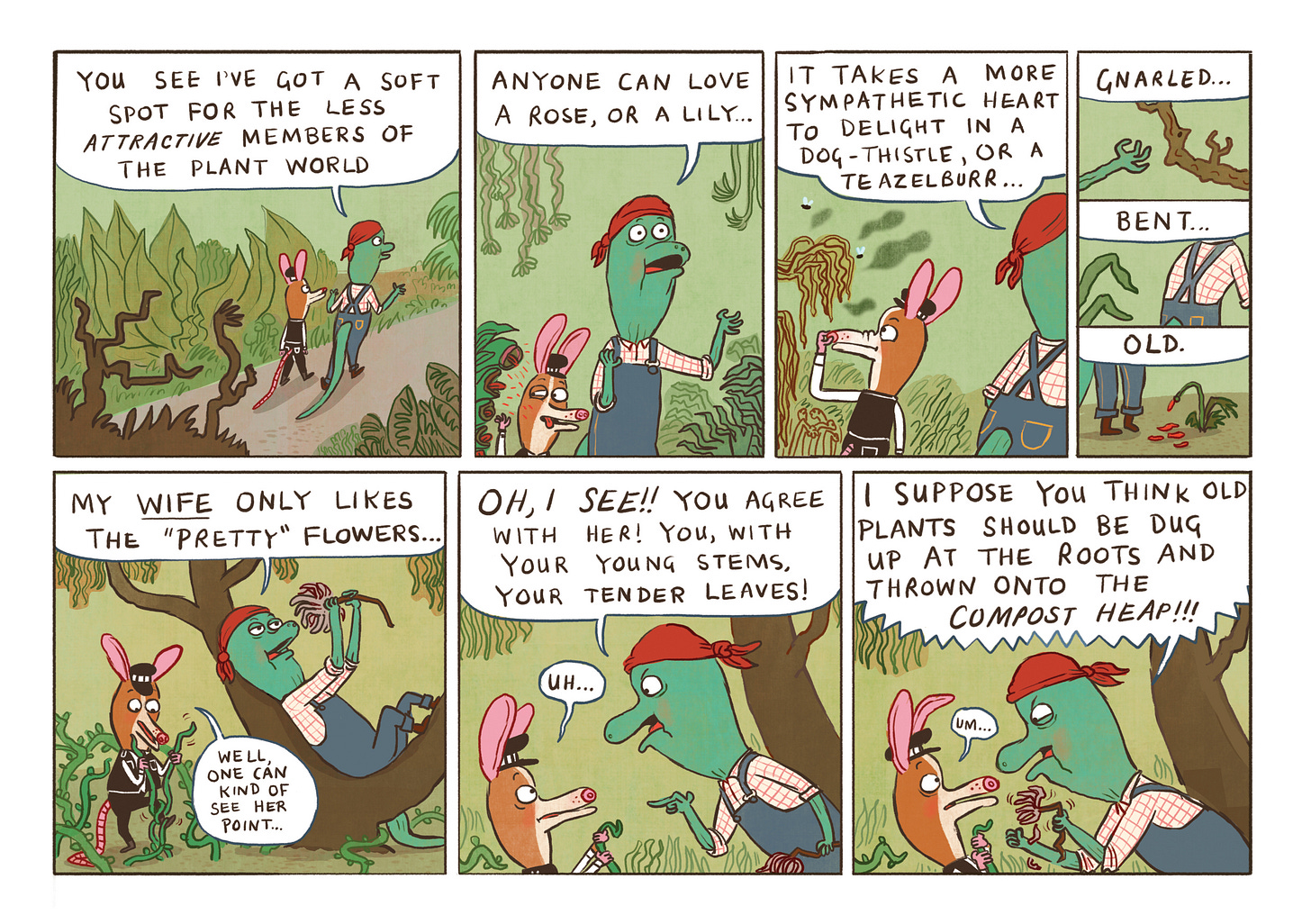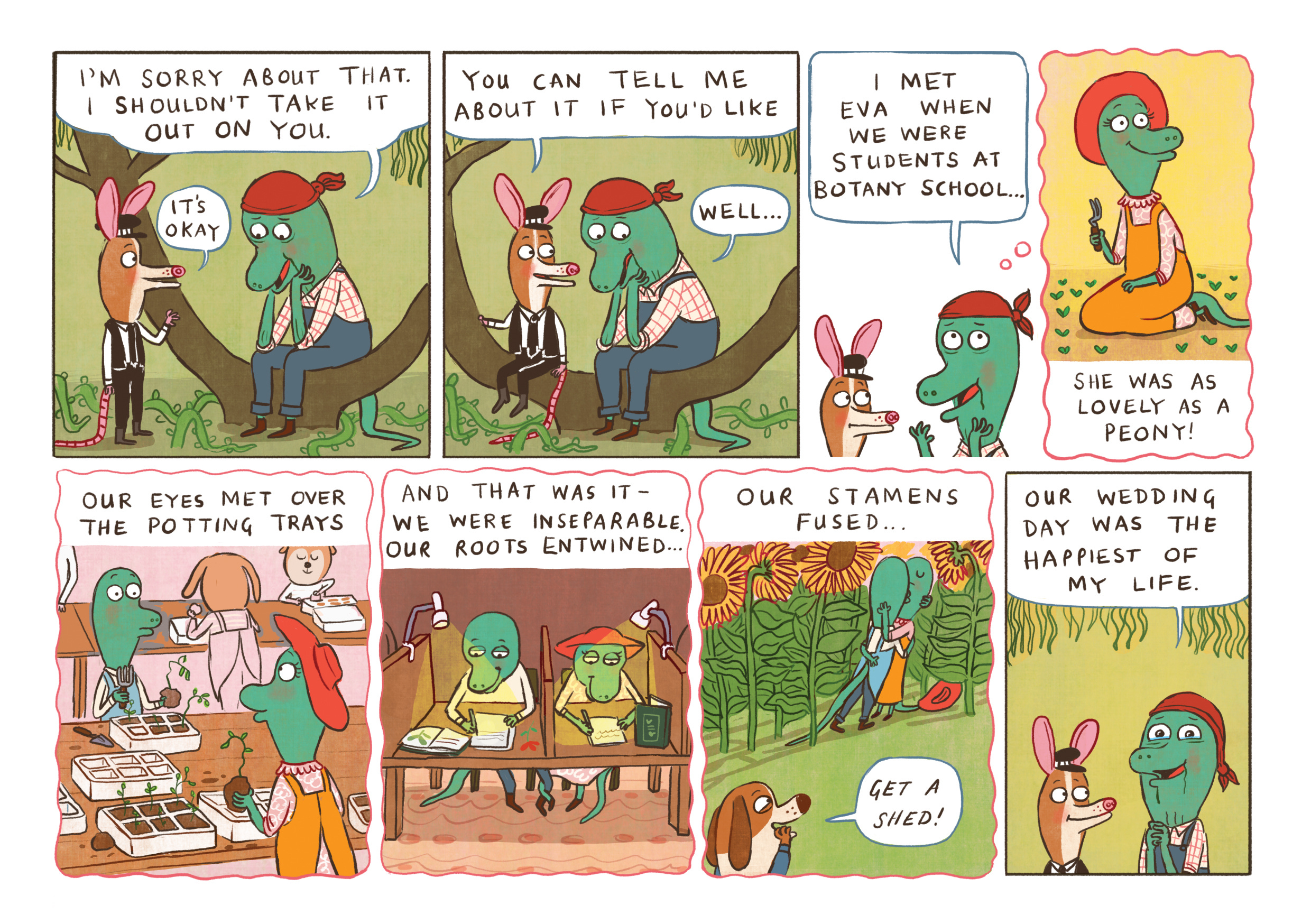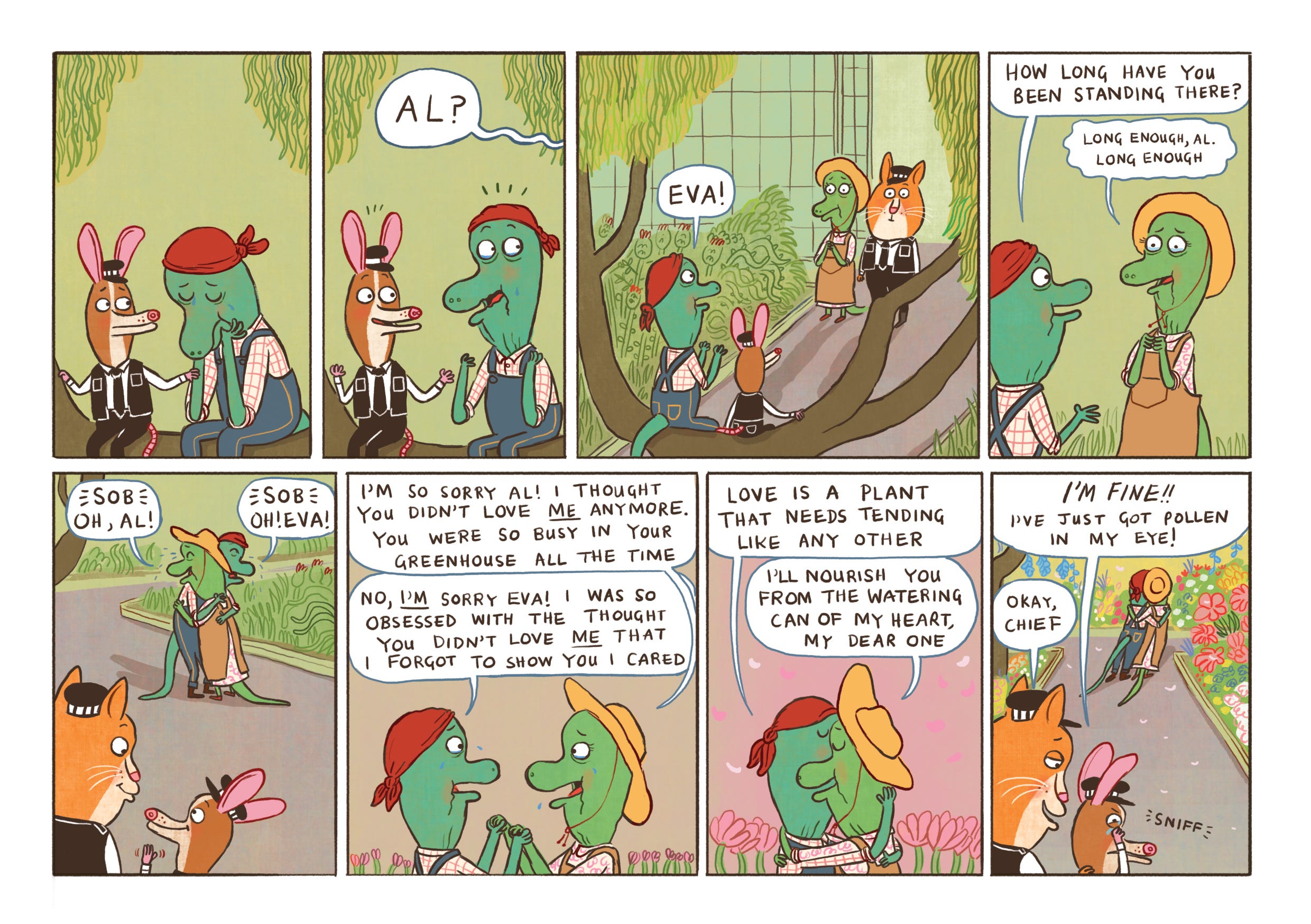 I think originally the gardener Al was a serious weird-plant-breeding baddie who bashed Jessie on the head and tried to feed her to a carnivorous plant, but I must’ve been in a soppy mood, as look what happened instead. Absolute whimsy! ❤️
