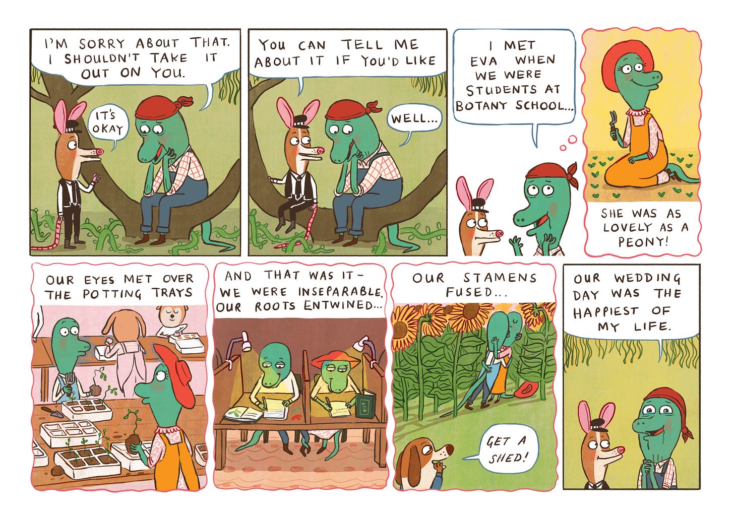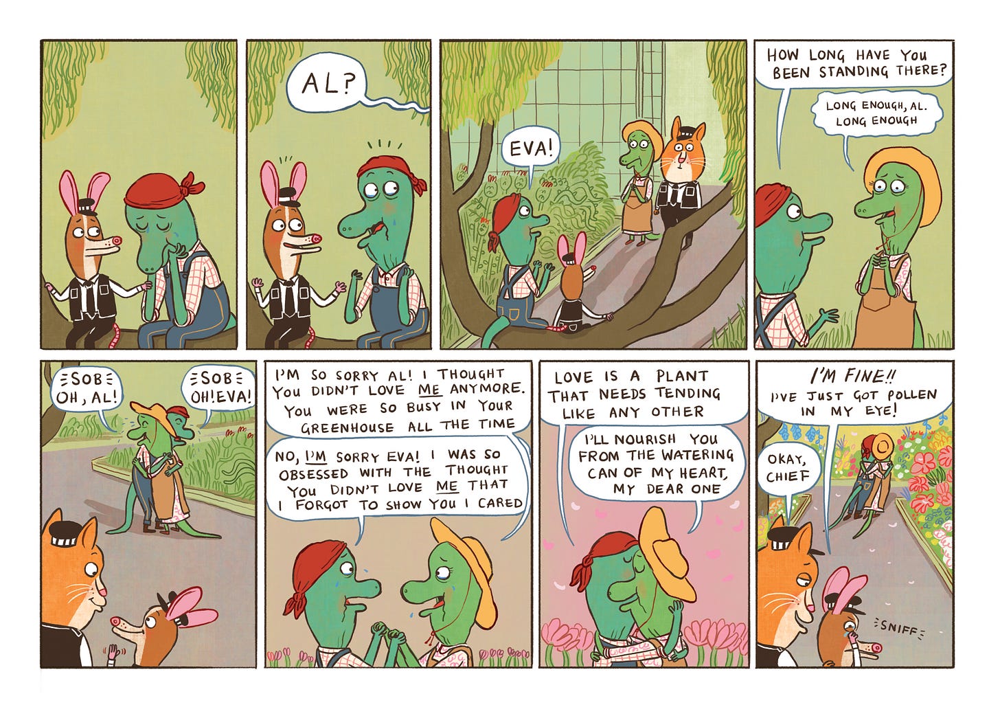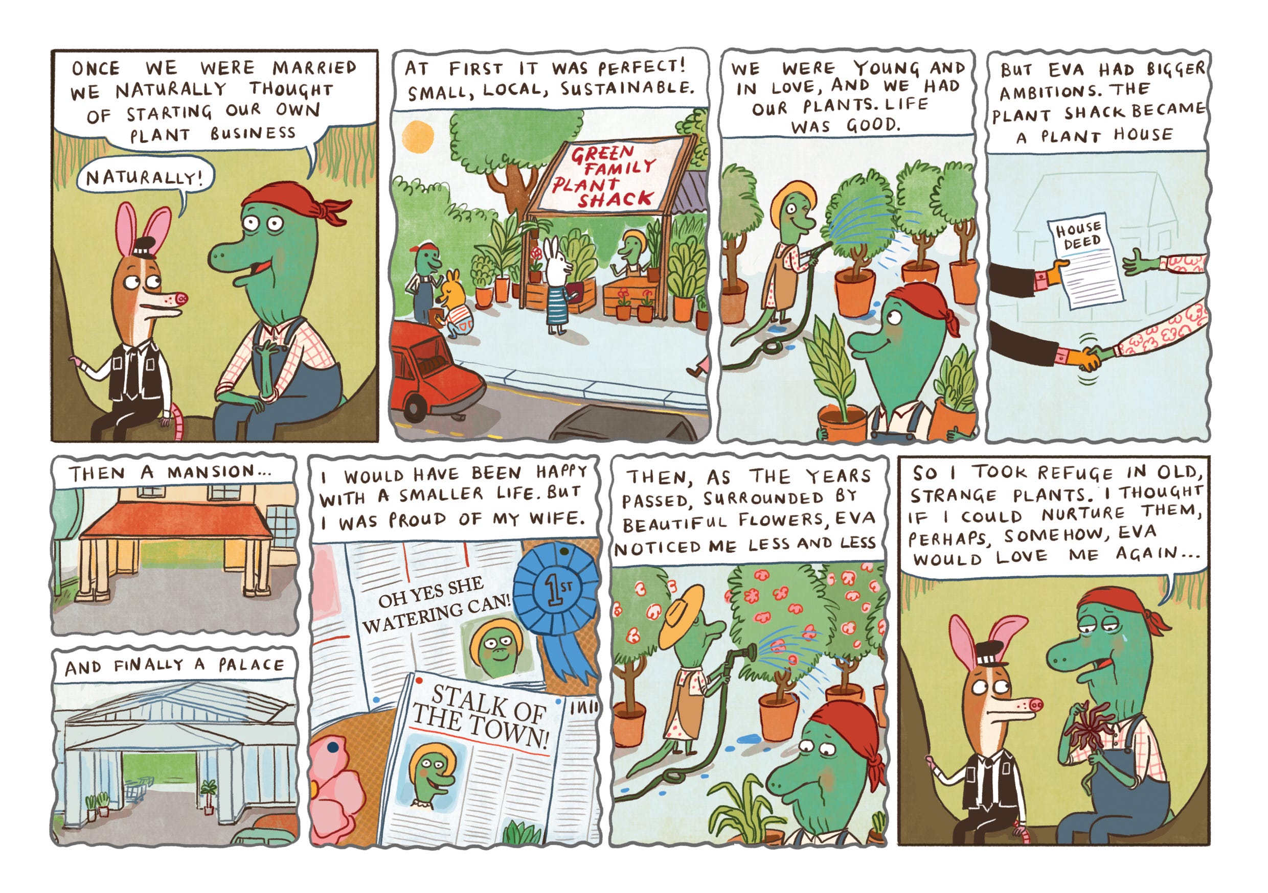 I think originally the gardener Al was a serious weird-plant-breeding baddie who bashed Jessie on the head and tried to feed her to a carnivorous plant, but I must’ve been in a soppy mood, as look what happened instead. Absolute whimsy! ❤️